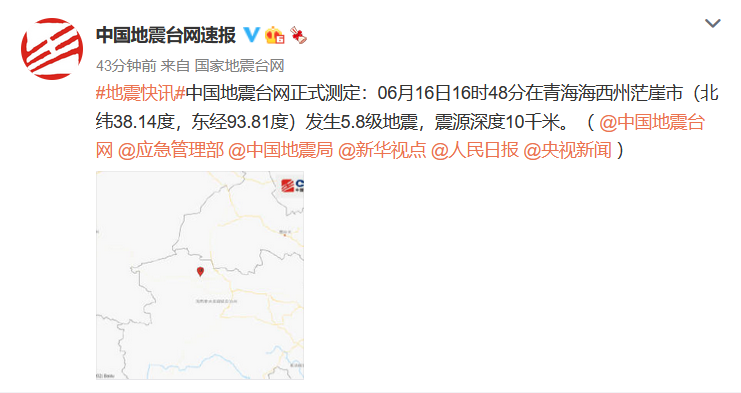06月16日16時(shí)48分在青海海西州茫崖市發(fā)生5.8級地震