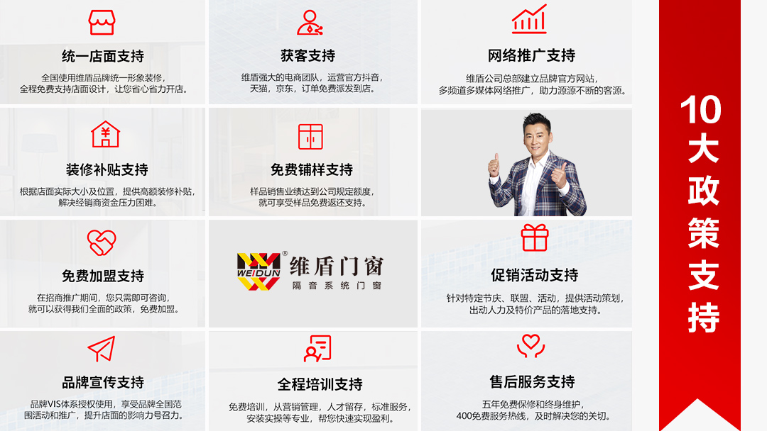 為加盟商賦能,助力終端門店快速成長。政策力度空前,加盟維盾門窗,好前景,高毛利,強(qiáng)強(qiáng)聯(lián)合搶占藍(lán)海紅利!