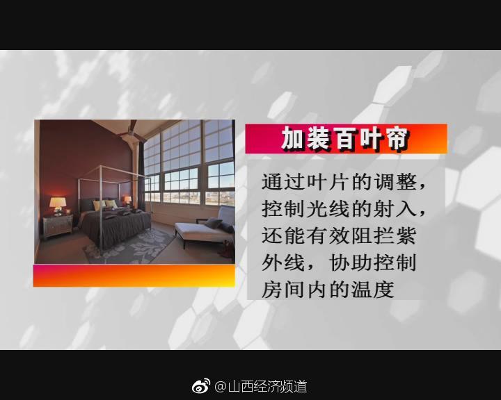 除此之外,節(jié)目組還建議可以采用百葉簾,當百葉窗完全收起時,不遮擋窗外的景色,放下時可使屋內(nèi)外完全隔絕,個人隱私也得到了保護。而且通過葉片的方向調(diào)整,既能輕松控制光線的射入,還能有效阻攔紫外線,協(xié)助控制房間內(nèi)的溫度,阻絕冷熱氣。